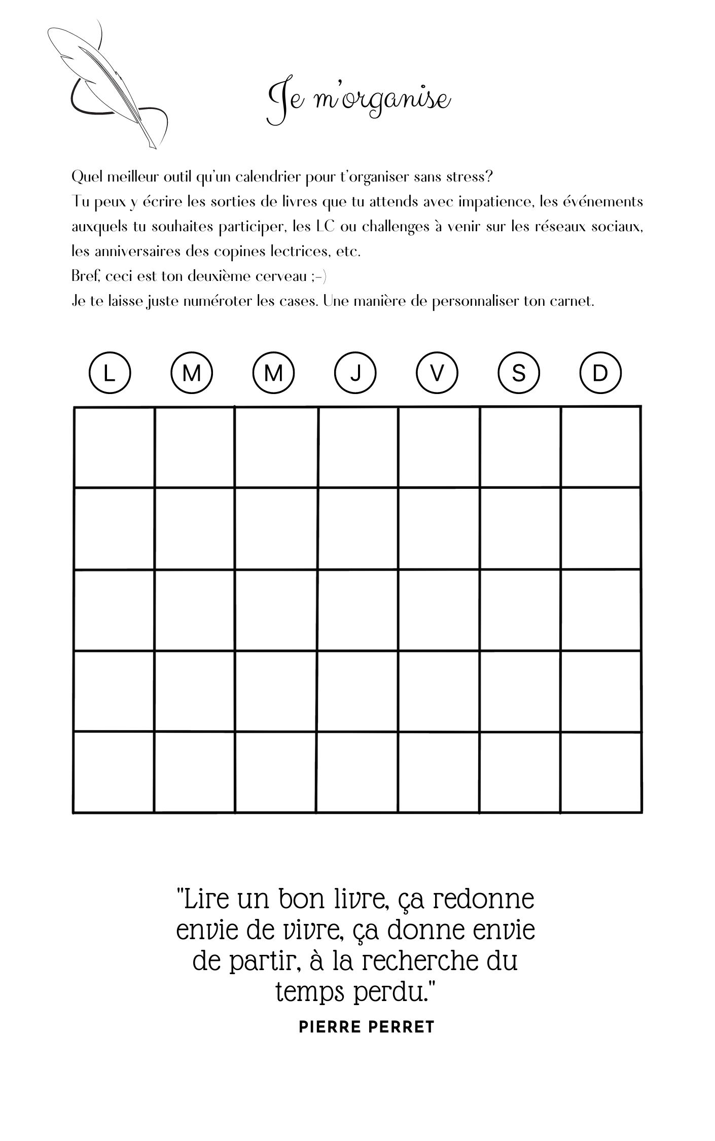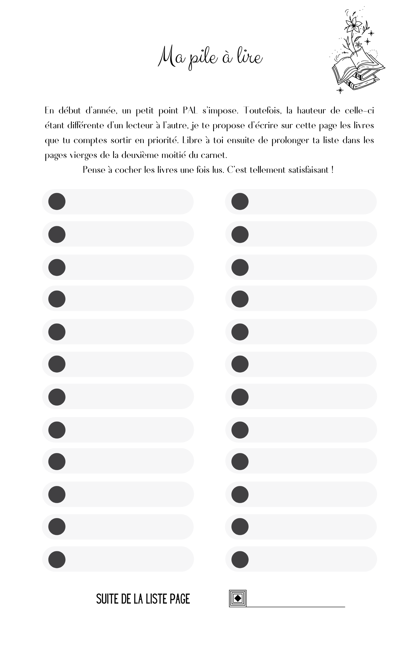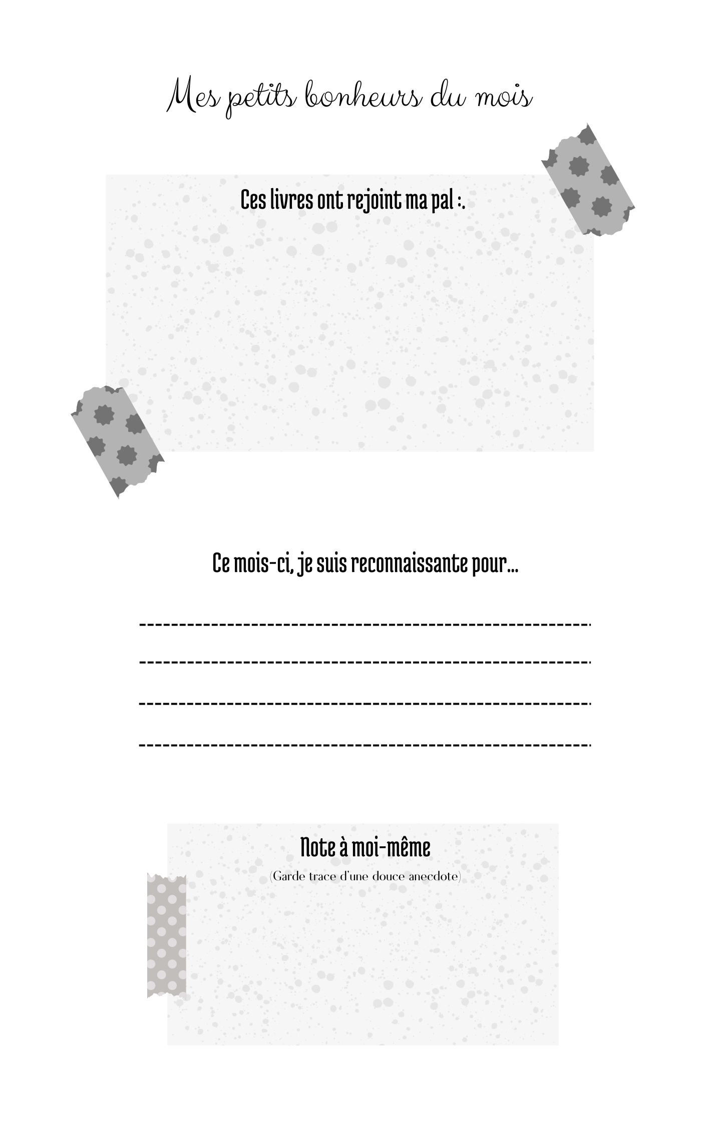 Grâce à ce reading journal d’un nouveau genre, planifiez vos lectures et vos challenges, notez les événements littéraires auxquels vous souhaitez participer, ainsi que les sorties de romans que vous attendez avec impatience.
